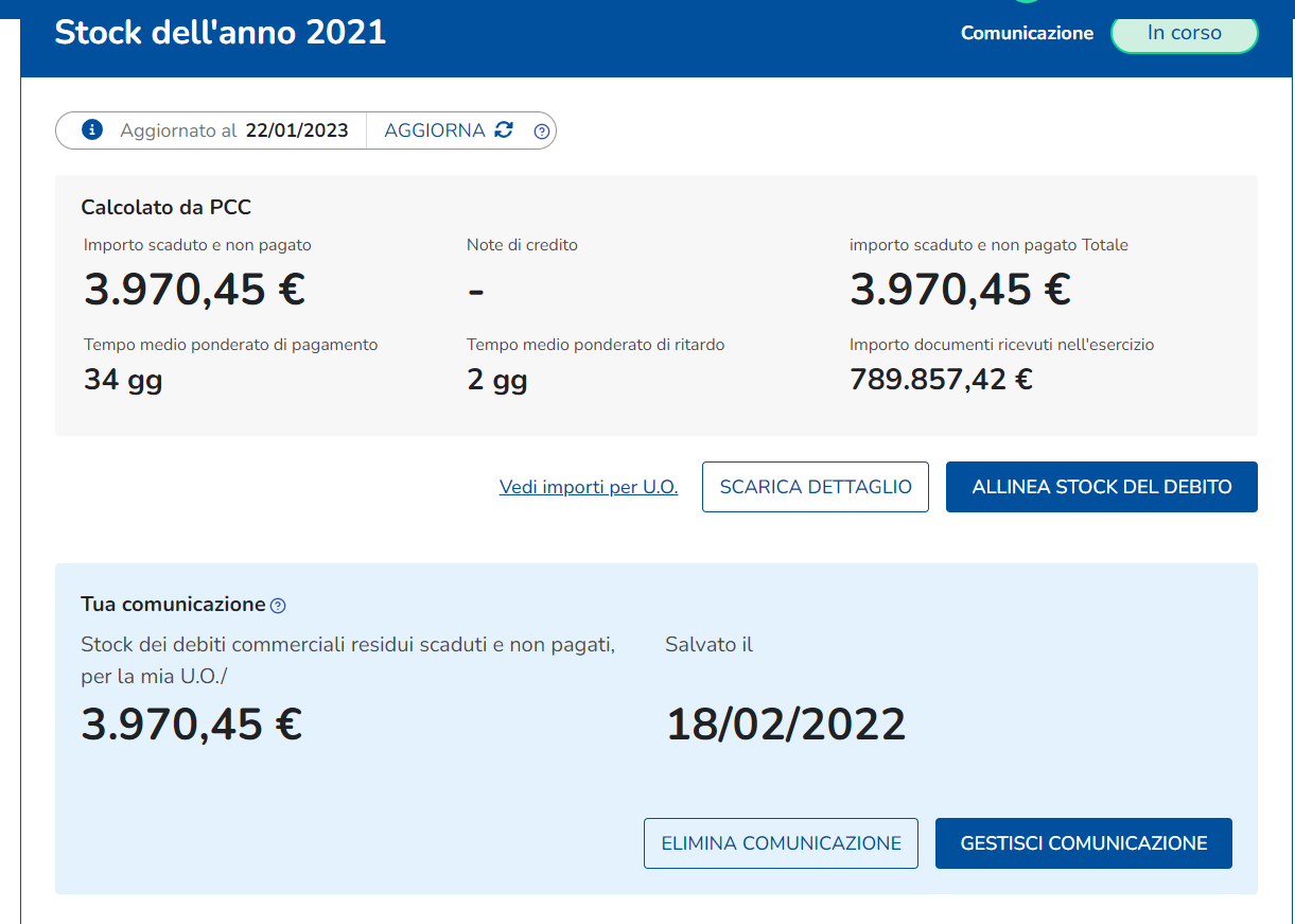 Ammontare complessivo dello stock dei debiti commerciali residui scaduti e non pagati alla fine dell'esercizio 2022 (art. 1 comma 867 della Legge 145/2018 e s.m.i.)