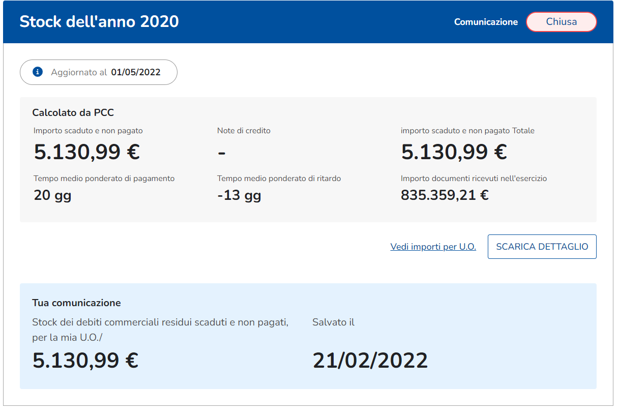 Ammontare complessivo dello stock dei debiti commerciali residui scaduti e non pagati alla fine dell'esercizio 2020 (art. 1 comma 867 della Legge 145/2018 e s.m.i.)