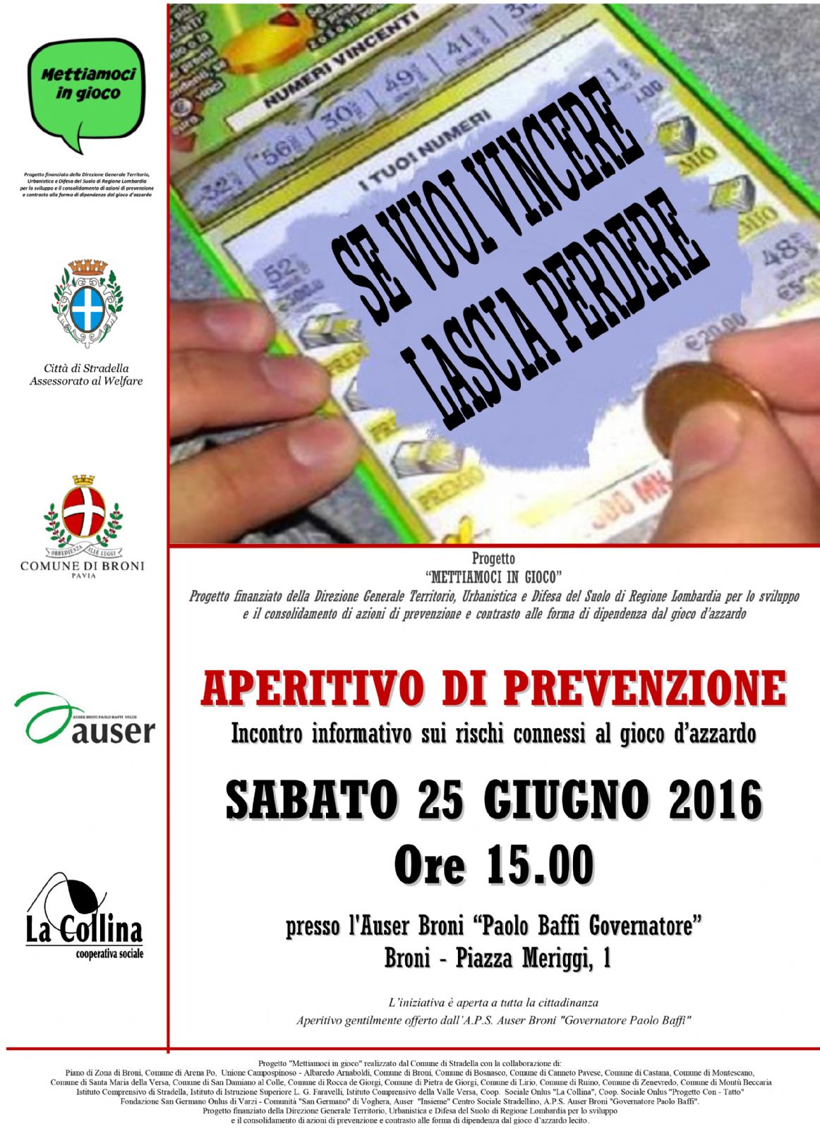 LOCANDINA AUSER - Aperitivo di Prevenzione - Incontro informativo sui rischi connessi al gioco d'azzardo con aperitivo offerto da AUSER BRONI - SABATO 25 GIUGNO 2016 ORE 15.00 presso Auser Broni - Piazza Meriggi n. 1