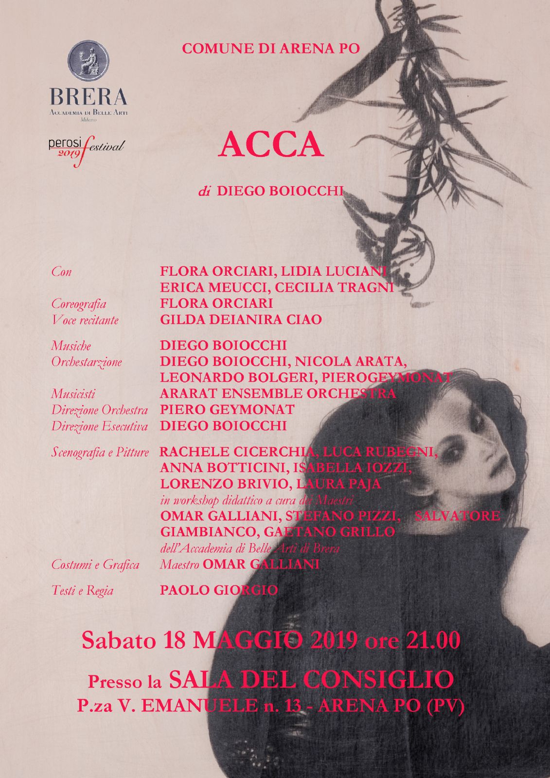 Presso la Sala del Consiglio in piazza Vittorio Emanuele n. 13 ad Arena Po la sera di Sabato 18 Maggio 2019 alle ore 21.00 sarà allestita l'Opera teatrale "ACCA" originariamente prevista in allestimento presso gli spazi pertinenziali all'aperto di Torre dé Beccaria, causa previste avverse condizioni meteo. Ingresso libero, fino a raggiunta capienza spazi. Musiche originali eseguite dal vivo dalla Ararat Ensemble Orchestra composta per la serata da 10 elementi, coreografa e quattro danzatrici Civica Scuola di Teatro Paolo Grassi di Milano, con voce narrante, scenografie workshop di pittura di Brera, regia di Paolo Giorgio (Grassi di Milano), costumi e grafica del Maestro Omar Galliani di Brera, musiche originali e direzione esecutiva orchestra di Diego Boiocchi, autore opera Diego Boiocchi. Opera realizzata in collaborazione con Comune di Arena Po, Comune di Tortona, Fondazione C.R. Tortona, Diocesi di Tortona, Accademia di Belle Arti di Brera, Perosi Festival.